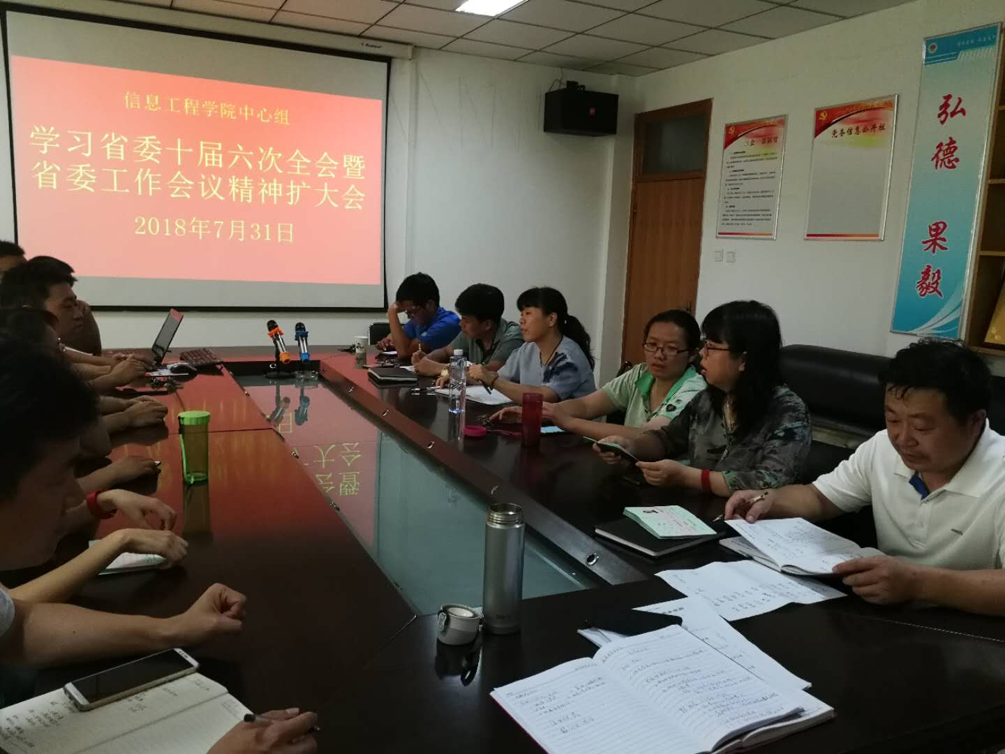 7月31日下午,tyc7111cc太阳成集团在院会议室召开二级中心组扩大会议,学习省委十届六次全会暨省委工作会议精神。学院科级以上干部和高级职称人员参加了会议,会议由院党总支书记潘胜寒主持。