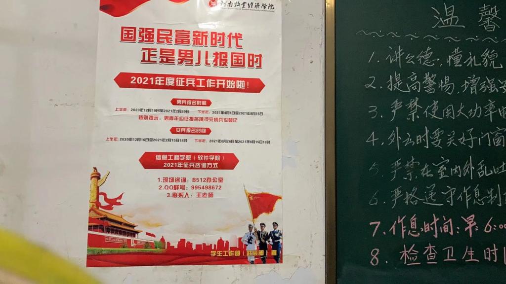 征兵期间,学院在宿舍楼、办公室门口等处张贴宣传海报,在学生寒假离校前发放宣传单页,通过QQ、微信班级群广泛宣传征兵政策,并组建征兵工作Q