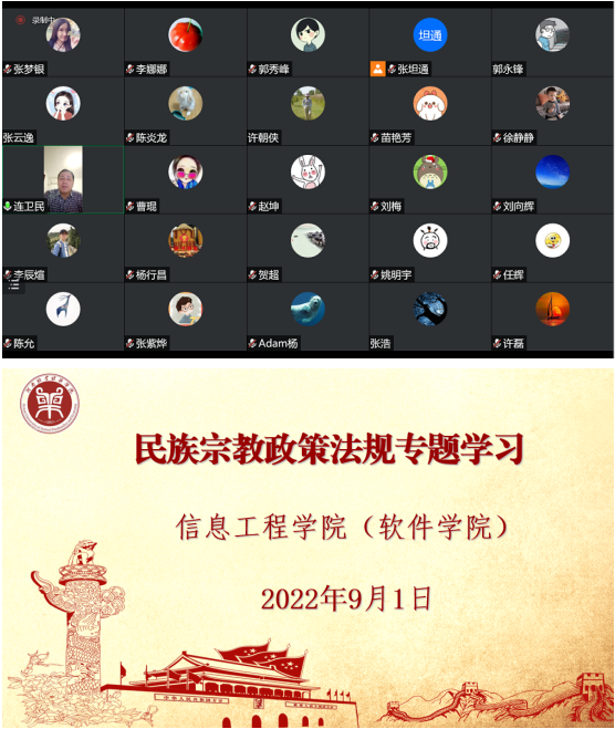 9月1日晚,tyc7111cc太阳成集团(软件学院)通过腾讯会议召开全体教工会议,开展民族宗教政策法规引学活动。会议由院长连卫民主持,学院全体教职工参加学习。