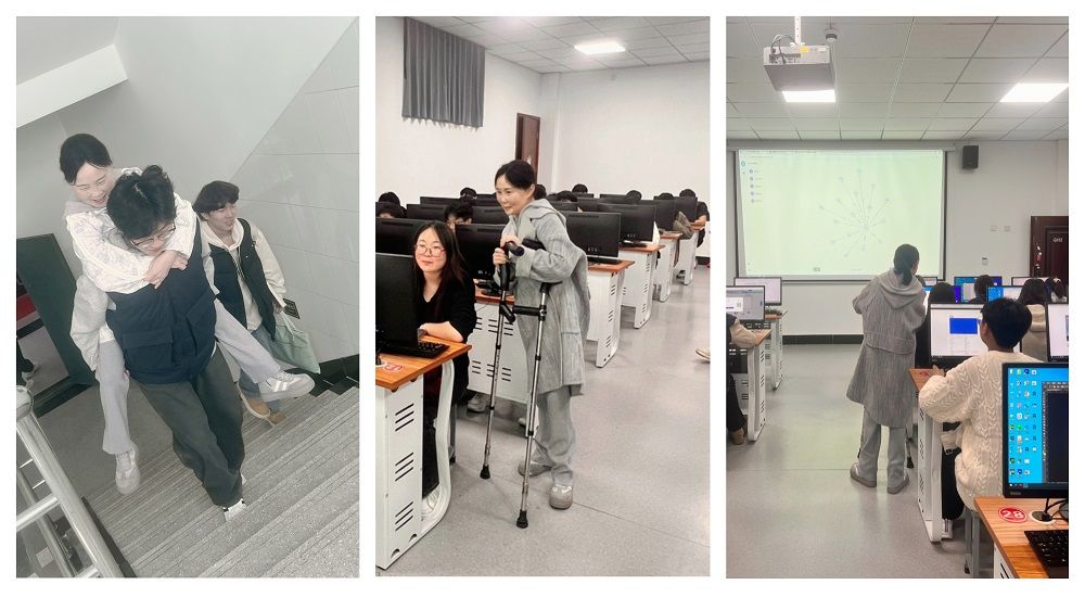 我不能让学生为我的意外买单,于是张老师就主动申请返校上课。教学楼没有电梯,而实验课教室偏偏设在六楼。过去一个月,六个班332位大一新生的人工智能实验课一节未停。站在机房里的张庆莉老师手拄双拐,却神采奕奕。没有人知道,她是被学生轮流背上六楼的。