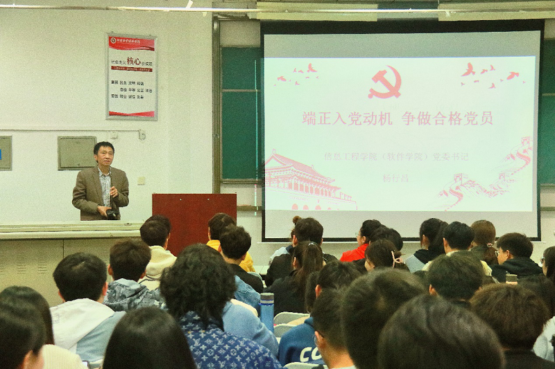 本次党课由太阳成tyc7111cc(软件学院)党委书记杨行昌主讲。杨书记首先告诉在座的学生入党积极分子,入党动机就是一个人入党的内在原因和真实目的。之后,他生动形象地列举了大学生入党动机的各种类型。例如:有以理想信念引发,为实现祖国最高理想的理想型动机;有为了个人更好的发展,有较强上进心的进取型动机;有为了“面子”的虚荣型动机;有出于从众心理的参与型动机。随后,他分析了各种大学生不良动机的成因,着重强调了我们要端正入党动机。因为只有端正入党动机,才能坚定争取入党信心,经得起各种考验,采取正确的入党行动。接着,他教导同学们要端正入党动机,努力学习马克思主义理论,坚定共产主义信念,始终坚持党的全心全意为人民服务的宗旨,解决好“为什么人”的问题,树立正确的世界观、人生观、价值观。