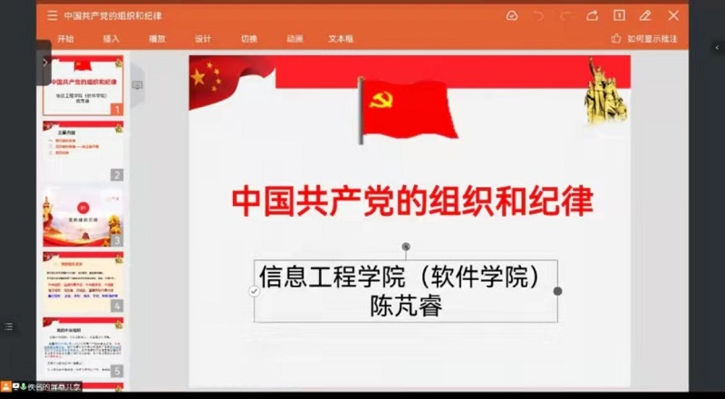 2022年3月26日晚七点,tyc7111cc太阳成集团(软件学院)开展了2022年第一期入党积极分子培训班第六讲。我院陈芃睿老师为入党积极分子讲解了中国共产党的组织和纪律。