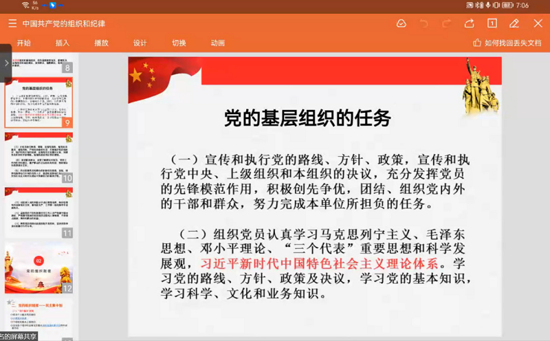 陈芃睿老师主要从党的组织系统、党的组织制度——民主集中制和党的纪律三个方面展开讲述。为大家讲解了党的组织系统是由党的中央组织、地方组织、基层组织构成,并说明了各层次党组织在整个党组织机构运转的地位、职责、作用的不同。在第二部分中陈芃睿老师为大家介绍了民主集中制的“四个服从”原则,告诫各位入党积极分子服从党组织的指挥和安排。在党的纪律方面,陈芃睿老师为大家悉心讲述“三大纪律八项注意”的形成发展和核心内容,告诉同学们我们党在“三大纪律”的基础上历经20年的不断实践和修改,最终形成了三大纪律八大注意。陈芃睿老师的讲述让大家深刻认识到了组织严密、纪律严明是党的优良传统和政治优势,同时是我们党的力量所在;守纪律、讲规矩,是对党员干部党性的重要考验;党的纪律和党的规律是全体党员的行为规范和行动准则,也是党的凝聚力、战斗力的重要体现和可靠保证。