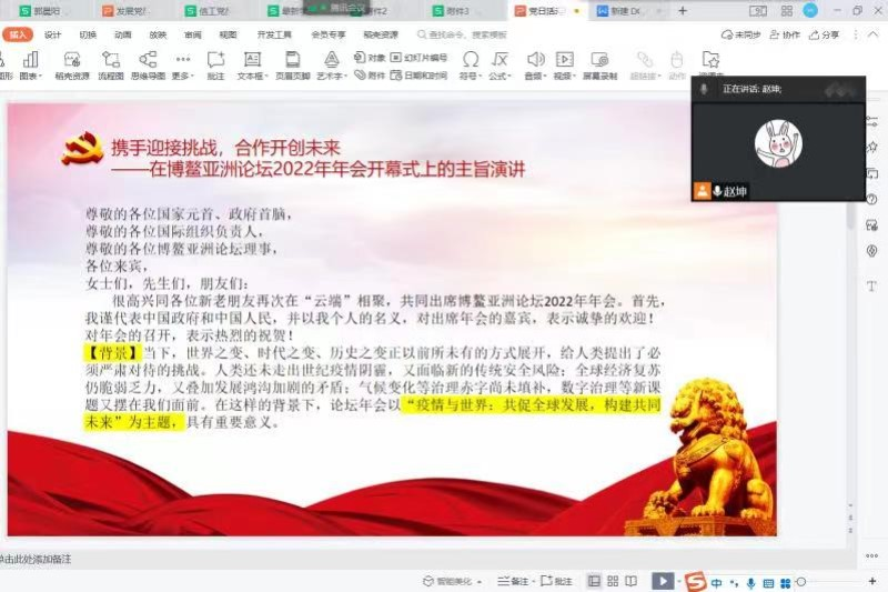 本次活动主要学习了习近平总书记在博鳌亚洲论坛 2022 年年会开幕式上的主旨演讲《携手迎接挑战,合作开创未来》、习近平在庆祝中国共产主义青年团成立 100 周年大会上的重要讲话、支部全体党员在线集中观看了视频《中共中央政治局常务委员会召开会议 分析当前新冠肺炎疫情防控形势 研究部署抓紧抓实疫情防控重点工作》。当前,疫情防控工作正处于“逆水行舟、不进则退”的关键时期和吃劲阶段,党中央号召各基层党组织要坚定信心,深刻认识抗疫斗争的复杂性和艰巨性,充分发扬斗争精神,坚决筑牢疫情防控屏障,做到守土有责、守土尽责。我们广大党员、干部也要继续冲锋在前、顽强拼搏,发挥先锋模范作用。