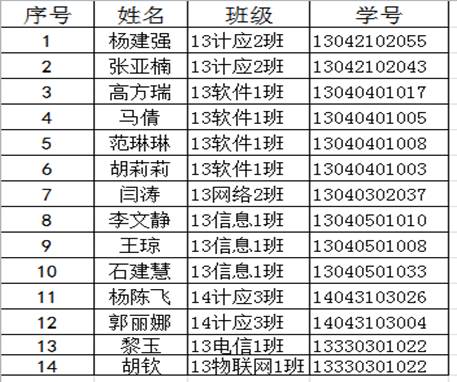 根据《关于做好2016年高校毕业生求职补贴发放工作的通知》(豫人社就业〔2016〕6号)文件精神和学校有关具体要求,根据自愿申请、公平公正的原则,经学生个人申请,辅导员认真审核,系领导严格复查,拟推荐杨建强等14名学生(具体名单见下表)为2016届毕业生求职补贴申报对象,现向全系师生予以公示,公示期为3月15日-3月19日。如对上述人选有任何异议,可在公示期内以口头或书面形式报信息与电子工程系学生工作领导小组(英才校区教学办公楼201)。