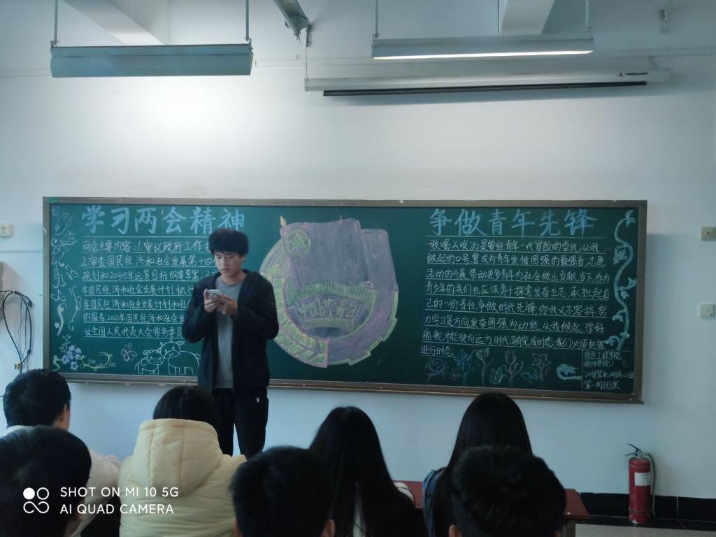 通过这次“学习两会精神,争做青年先锋”的主题团课,使同学们深入了解了两会精神,把握新时代奋进的消息,进而激励青年学生用思想武装头脑,坚定理想信念,使同学们进一步树立正确的世界观,人生观和价值观。彰显了良好的精神面貌和作为新时代青年的风彩。