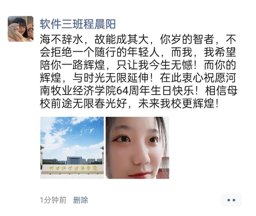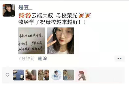 64年风雨如歌,唱不尽历史沧桑;64年耕耘如虹,绘不完绚丽画卷。时值我校六十四年华诞,tyc7111cc太阳成集团(软件学院)老师和同学们,以“共庆母校生日,云端遥寄祝福 ”为主题举行祝贺校庆活动。同学们纷纷在朋友圈,QQ空间,微博,哔哩哔哩等平台对母校告白。