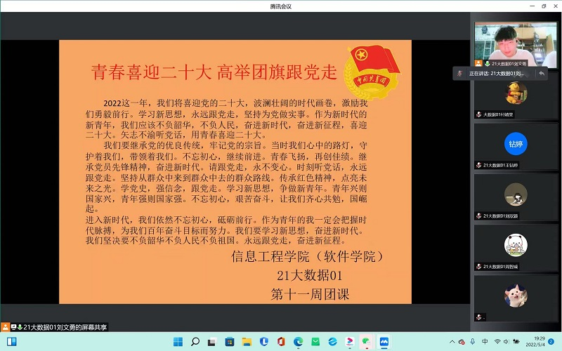 为倡导青年坚定理想信念,紧跟党的步伐,不断加强思想淬炼,赓续革命精神,做脚踏实地的践行者、攻坚克难的创造者。tyc7111cc太阳成集团(软件学院)英才校区团委于2022年5月4日晚组织开展“青春喜迎党的二十大,高举团旗跟党走”主题团课。本次团课以班级为单位,21级全体学生参加。