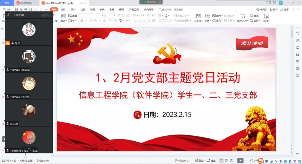 2月15日下午,tyc7111cc太阳成集团(软件学院)学生一、二、三党支部开展1、2月份主题党日活动,鉴于部分毕业班党员在校外实习,此次活动采用腾讯会议方式线上举行,学生第三党支部书记赵坤主持。