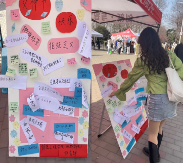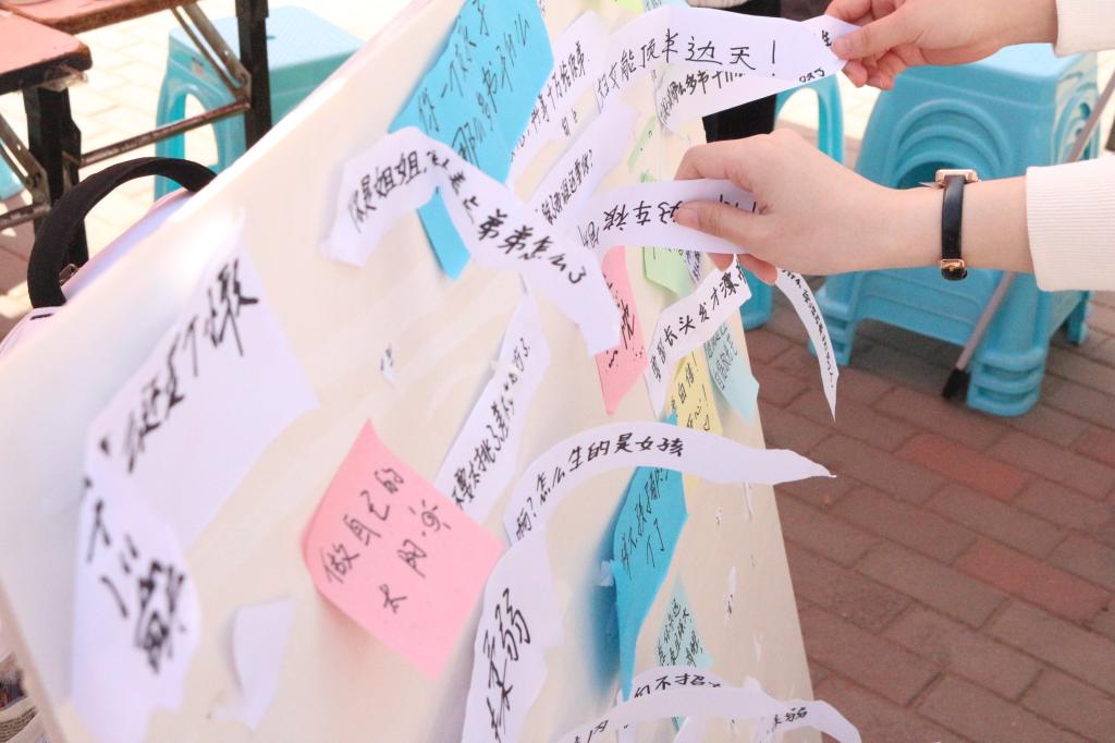 活动当日,路过的同学撕掉板子上对女性的刻板标签,用便利贴写上自己想说的话,之后会收到糖果作为祝福。在此次活动中,同学们都积极参加,勇于撕掉那些强加在女性身上的标签,并且写下激励自己的语句,看着那一句句激励人心的话语,同学们产生共鸣并且红了眼眶;还有一些女同学刚开始不敢上前,但看到很多同学都勇于撕掉标签,被现场的气氛感染到,也鼓起了勇气上前撕掉标签写下话语……这一幕幕充分展现出了新时代女性的勇气与力量。女同学们坚决的撕掉别人给她贴的标签,说出了自己的真实想法,表达了内心顽强的自己。最后,参与此次活动的同学都领取到了精美小礼品和春日祝福语盲盒。