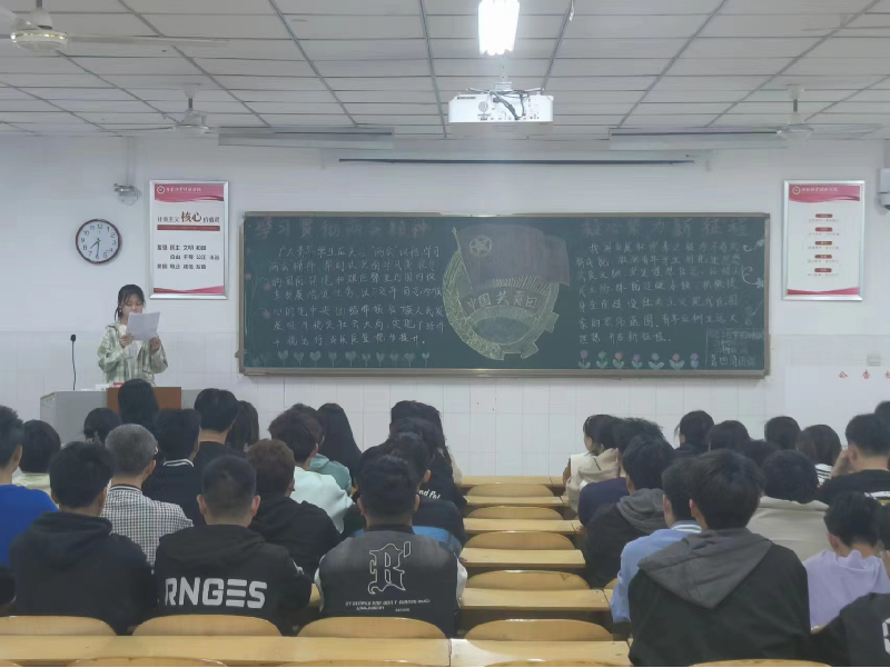 团课伊始,各班团支书带领同学们了解两会的历史、组成和会议议程。同学们了解到今年是全面贯彻落实党的二十大精神的开局之年,开好全国两会,把党的主张和人民意愿凝聚为国家意志,对贯彻落实习近平新时代中国特色社会主义思想和党的二十大精神,动员全党全国各族人民为全面建设社会主义现代化国家、全面推进中华民族伟大复兴而团结奋斗具有十分重要的意义。接着,各班团支书带领大家认真学习李克强总理所作的政府工作报告,同学们深刻认识到我国当前面对着风高浪急的国际环境和艰巨繁重的国内改革发展稳定任务。同学们纷纷表示要用先进思想武装头脑,坚定理想信念,站稳人民立场,练就过硬本领,积极投身全面建设社会主义现代化国家的宏伟蓝图。