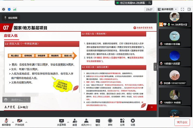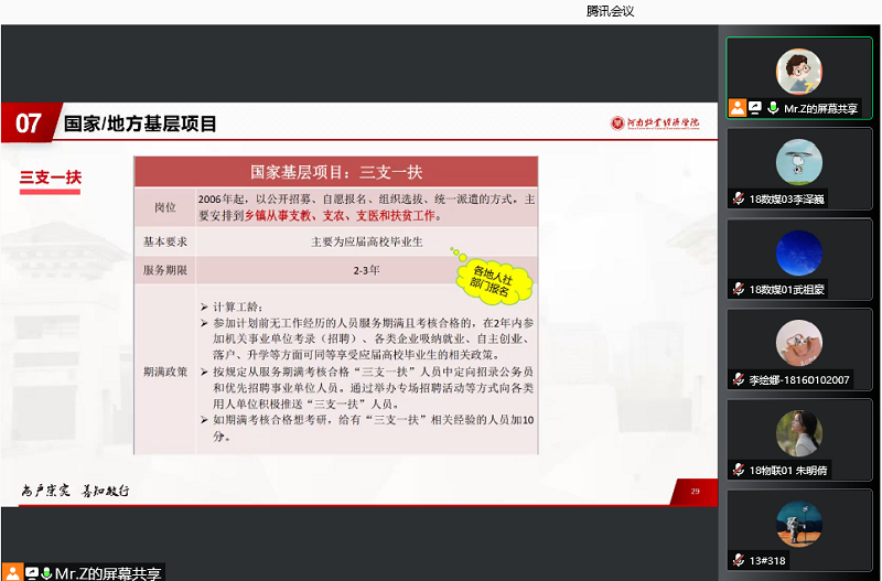 18级辅导员张紫烨老师在4月23日晚上召开了毕业生“走基层、促就业”线上专项主题班会,结合教育部发布的《关于做好2022届全国普通高校毕业生就业创业工作的通知》要求,针对“三支一扶”、“西部计划”、“特岗教师”、“大学生村官”、“参军入伍”、“直招士官”等中央基层就业项目的工作内容、报考流程和相关政策要求做了生动细致的宣传与讲解,并针对同学们的一些疑问进行在线解答。线下,张紫烨老师在办公室为部分对“西部计划”和“参军入伍”等基层项目感兴趣的同学进行答疑解惑,针对不同的同学提出了详细而具体的建议。