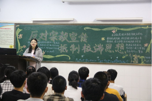 为了使同学们进一步提高识别、抵御和了解宗教安全;培养学生正确的世界观、人生观。2019年9月11日晚上七点三十分,tyc7111cc太阳成集团于教学楼A栋3楼组织新生参加“反对宗教宣传,抵制极端思想”为主题的班会。