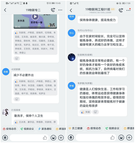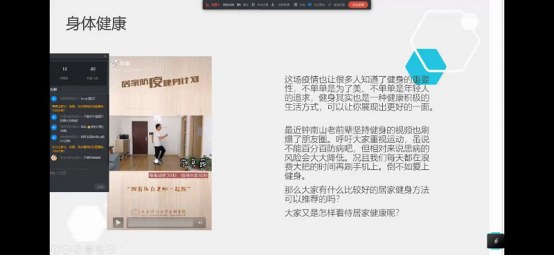 生命之珍贵,更凸显健康之重要。团课伊始,团课主持人带领学生学习了心理健康知识和正确戴口罩以及正确洗手等防疫知识,引导学生正确应对负面情绪,有效调适身心健康。随后,组织学生在线观看了居家健身运动微视频,倡导学生进行居家健康有氧运动,健康体魄。在团课上,同学们针对大学生应该如何保持身心健康这一问题展开激烈的讨论,以图片、文字、以及问答互动等多种形式分享了疫情期间健康体魄调节情绪的方法,并决定从自我做起,用科学的知识武装自己的头脑,养成良好的卫生习惯,加强运动,健康体魄,为夺取新型冠状病毒感染的肺炎疫情防控阻击战的最后胜利作出贡献!
