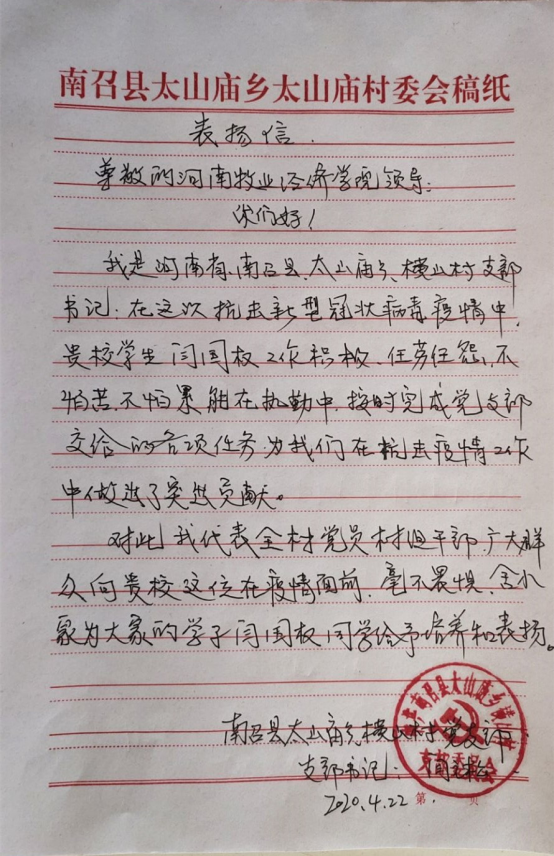 近日,河南省南阳市南召县太山庙乡横山村村民委员会发来表扬信,对我院2019级物联网工程02班班长闫国权同学在家乡疫情防控工作中的突出表现予以表彰和感谢。