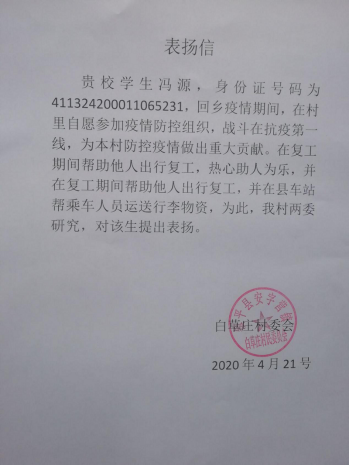 近日,河南省南阳市镇平县安字营镇白草庄村委会发来表扬信,对我院2019级物联网工程02班冯源同学在家乡疫情防控工作中的突出表现予以表彰和感谢。