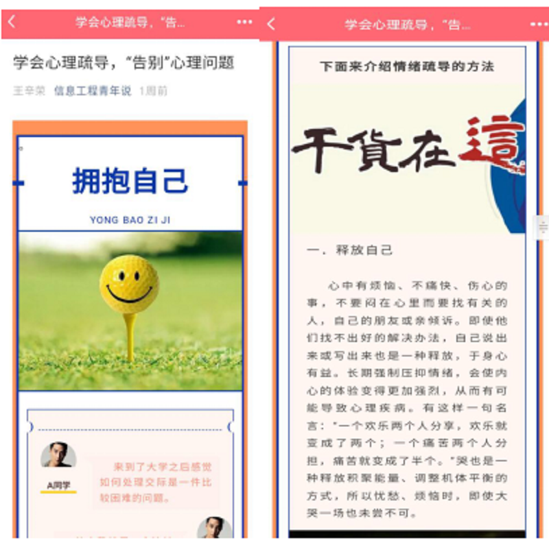 根据学生实际情况,我院心理部通过微信公众号、QQ群、微信群等线上方式宣传普及与心理调适、情绪疏导等相关的心理健康知识。通过线上宣传让同学们了解心理健康方面的知识,减轻自我内心矛盾和冲突,保持积极乐观的心态。