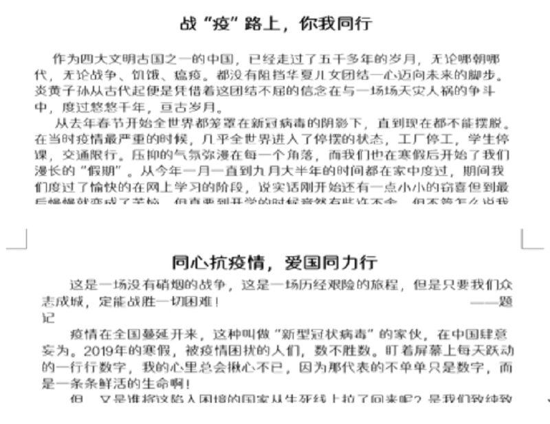 为培育学生自尊自信、理性平和、积极向上的健康心态。我院开展了以‘同心抗疫,绽放青春’为主题的征文活动。此次征文大赛意旨让学生们以文字的形式来调动自我心理防疫的积极性,同学们积极参加,结合自身的心路历程,分享了大家身边抗疫的感人事迹,用书写的力量为中国加油,抒发了对伟大祖国和奔赴抗疫前线的英雄的敬仰之情。通过此次活动,不仅培养了同学们的爱国情怀,弘扬了抗疫精神,而且丰富了校园文化,营造了积极健康的氛围,促进了学生心理健康发展,对构建文明校园起到了积极作用。