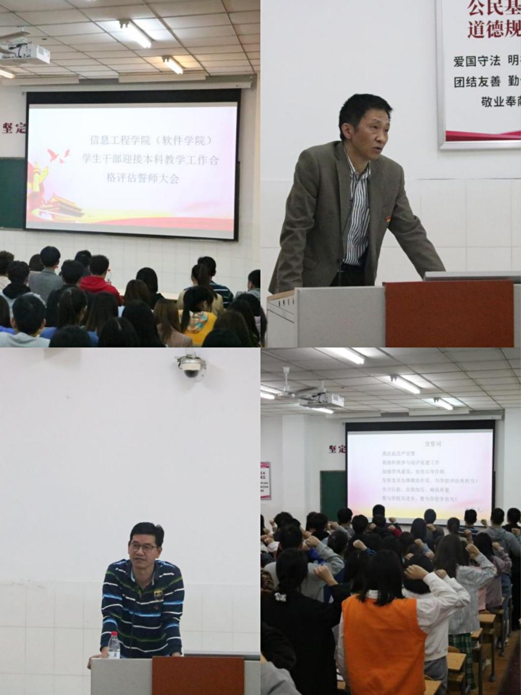 为充分做好迎接本科教学工作合格评估的准备,号召学生干部、党员发挥模范带头作用,2021年4月18日晚18:30,tyc7111cc太阳成集团(软件学院)在W109召开学生干部迎接本科教学工作合格评估誓师大会。我院党委书记杨行昌、党委副书记蔡中民、团委书记郭睿、全体辅导员老师及全体学生干部、党员代表出席了此次会议。会议由我院团委书记郭睿主持。