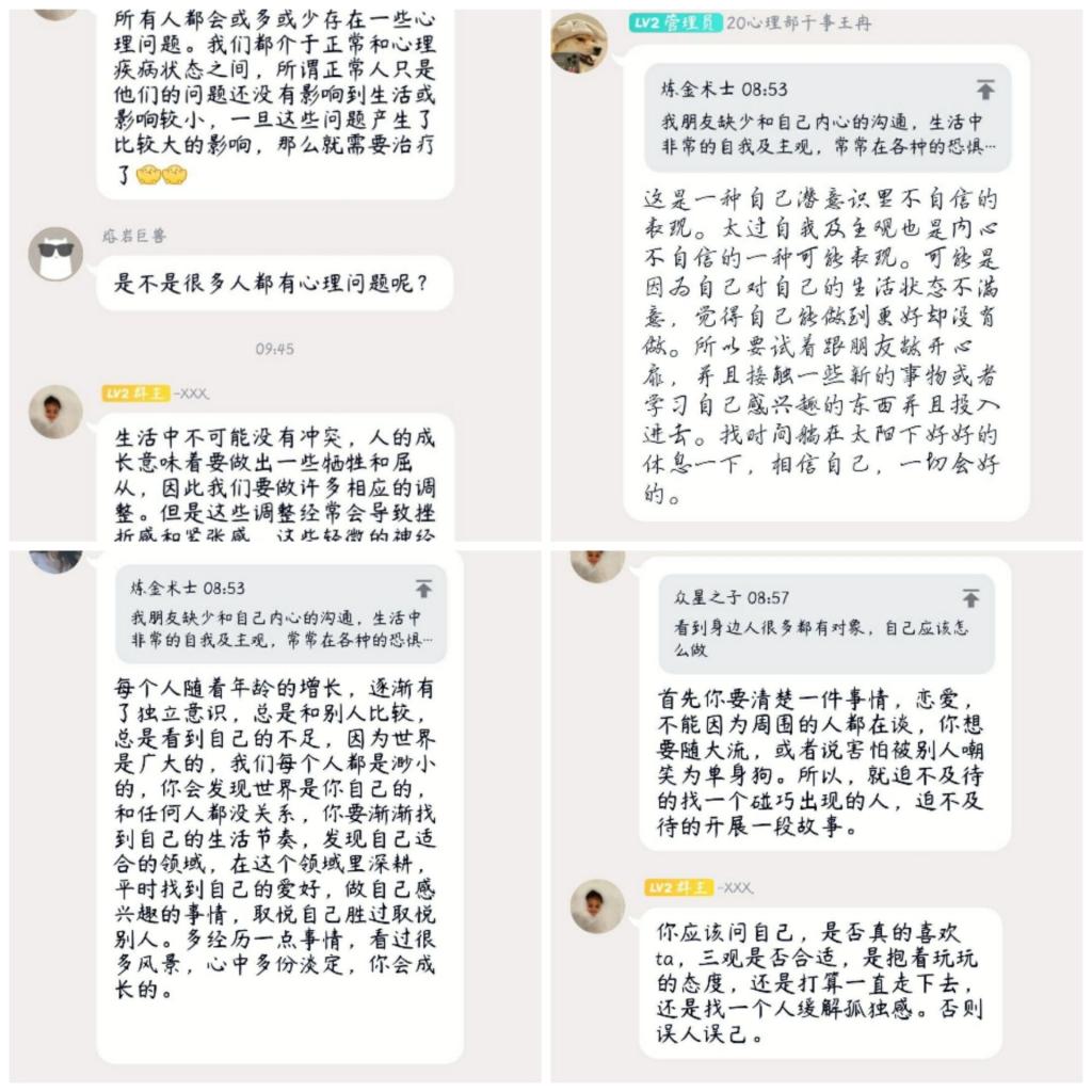 群聊中,学生党员为同学们解释了大学生心理问题的含义、以及解决心理问题的诸多方法。学生党员指出,多数人在人生发展过程中都会出现不同程度的心理问题。因而树立科学的人生观、形成正确的自我观念、有效控制情绪并保持良好心境,并培养良好的生活习惯和业余爱好、进行合理的心理调适以及向心理老师或者同学寻求心理咨询的帮助等就成为解决心理问题的重要方法。同学们在群聊中积极反馈自己所遇到的心理问题,学生党员及时进行开导,引导同学们正确对待生活中常遇到的心理问题,学生党员从多个角度,深层次地分析了大学生中存在的各种心理问题与心理障碍,并告诫同学们,不要害怕出现心理问题,重要的是及时解决问题,大家也要充分利用好身边的资源,多和心理咨询老师进行交流,以增进心理健康。进行心理问题交流的过程中,同学们之间也能够互相开导,并有效地解决了一些心理问题。
