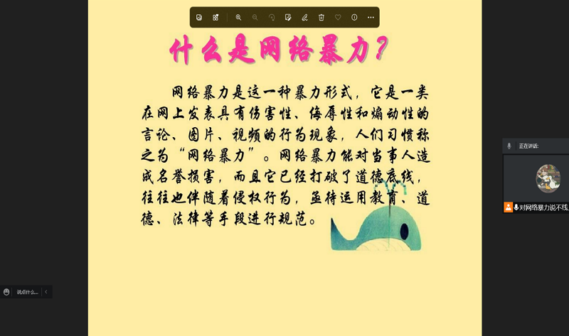 网络暴力异化了舆论监督的作用,它在无休止地恶意攻击当事人,许多不明就里的网民加入其中,并渐渐失去同情心和爱心,逐渐形成无聊的看客心理和冷漠的情绪。针对近期社会层面网络暴力事件频发、网络暴民频现的情况,为呼吁我院学生保持积极健康的心态,加强学生在互联网上的“主人翁”意识,引导学生积极主动的承担起维护网络环境、拒绝网络暴力的责任与义务,我院以线上形式举办了主题为“拒绝网络暴力,让爱与语言同行”的主题班会。