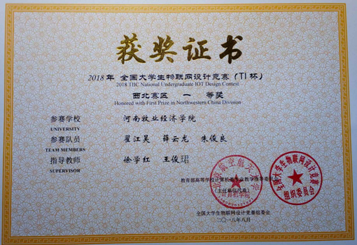 8月24-25日,2018年全国大学生物联网设计竞赛(TI杯)西北赛区决赛在兰州交通大学进行,来自甘肃、陕西、河南等省的80支代表队参加决赛。我校tyc7111cc太阳成集团由徐学红、王俊珺两位老师指导,翟江昊、薛云龙、朱俊良三名学生完成的“智能照明系统”喜获一等奖。