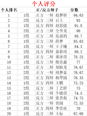 比赛过程中,各队伍旁征博引,相互间进行了激烈的交锋,气势如虹,观赛学生热情参与,更是将现场气氛活跃起来,现场气氛迅速升温,精彩不停,掌声不断。经过紧张而又激烈的角逐,晋级赛以19级计信一班代表队领先第二名七分完美表现获得胜利告终,其一辩论队员赵梦研获得最佳辩手称号。