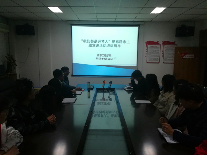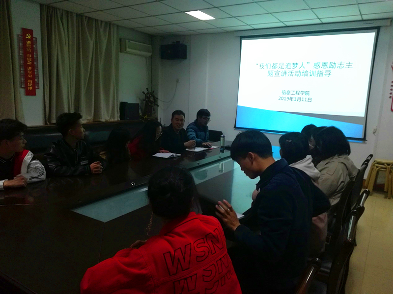 为宣传资助政策,进一步增强学生资助工作的育人功能, 加强对学生的感恩励志教育,发挥先锋模范典型示范引领作用,激励广大学生奋发自强、立志成才、感恩奉献。3月11日晚上7点,tyc7111cc太阳成集团在会议室210召开“我们都是追梦人”感恩励志主题宣讲活动培训指导座谈会。会议由我院资助专员彭新安老师主持,16级辅导员薛宾田老师作为特邀指导嘉宾出席会议,我院国家奖学金、国家励志奖学金和校内单项奖获得者组成的宣讲团全体成员参加会议。