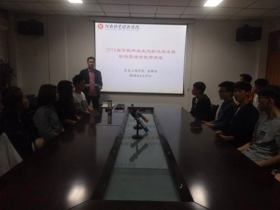 为指导2018届国家助学贷款毕业生顺利还款还息,开展诚信还款教育,4月27日晚上7点,tyc7111cc太阳成集团组织开展2018届国家助学贷款毕业生还款还息流程培训暨诚信教育讲座。本次培训由我院资助专员彭新安老师主讲和现场答疑,2018届贷款毕业生积极参加培训。