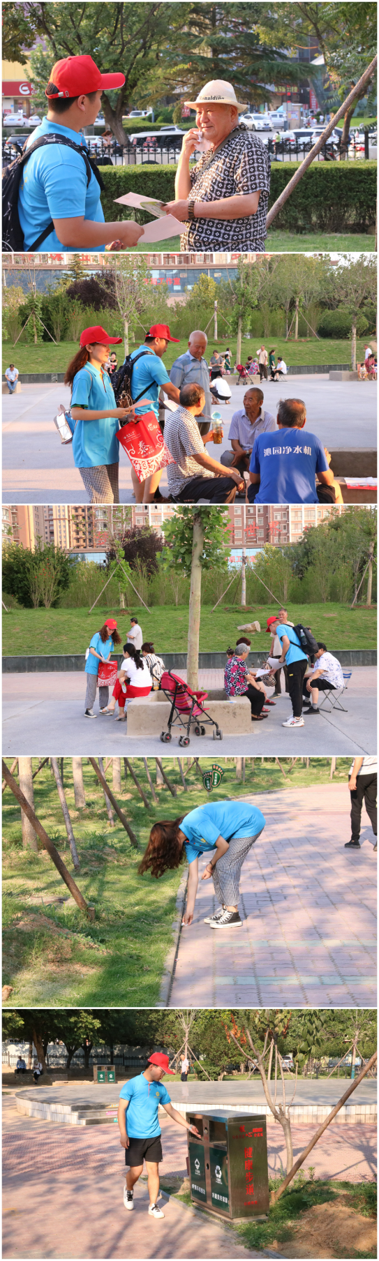 在开展“调研”期间,大家顶着烈日,深入京襄城广场最深处,对广场上纳凉的群众进行了深入调查。群众仔细看着问卷,对于不懂问题,志愿者成员对其进行了深入的解释,帮助他们了解这次问卷调查活动,使其可以认真进行问卷填写,以确保本次问卷调查活动所得数据的准确性“志愿”小组也不辞辛苦,在公园的各个角落寻找垃圾,并分类扔进垃圾桶,为维护美好环境做出贡献。